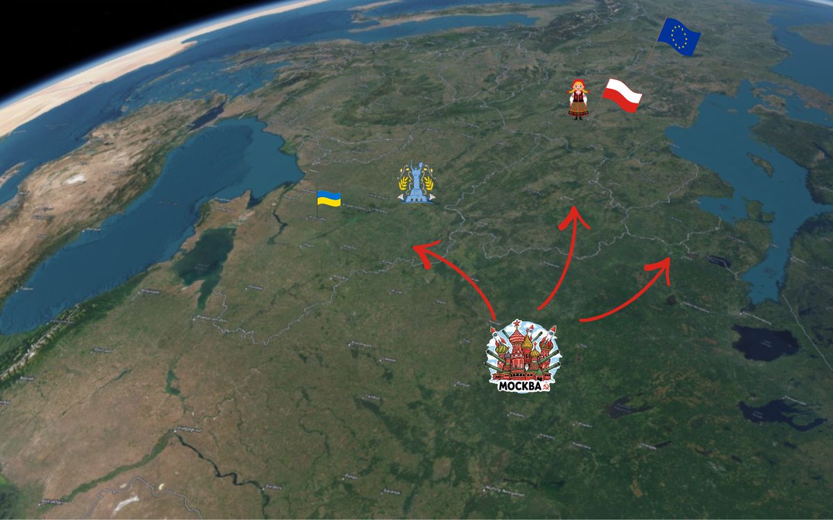 3/7) Abychom pochopili ruské kroky, musíme se podívat na mapu jejich očima. Středem je Moskva a pohled ruského generála nesměřuje na sever, ale na jihozápad. Dívá se do „trychtýře“ Severoevropské nížiny, který se směrem k Rusku nebezpečně rozšiřuje. V plném znění zprávy vysvětlujeme, proč jsou pro Rusko hranice jen čáry, kde končí kontrola, a proč je každý kilometr na západ vnímán jako čas koupený pro obranu.
