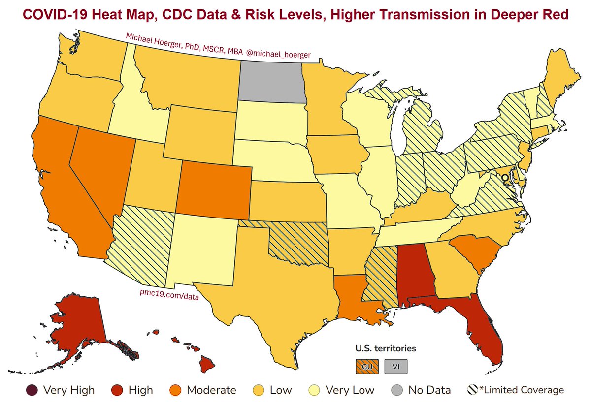 Transmission is "high" in Alaska, Hawai'i, Florida, & Mississippi. "High" means at least an estimated 1 in 75 infectious.