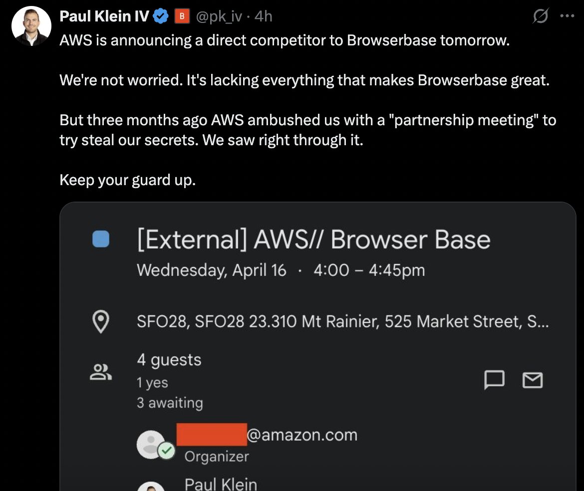 15. Amazon arranged a call with a startup called BrowserBase pitching in a partnership call, in fact trying to spy.