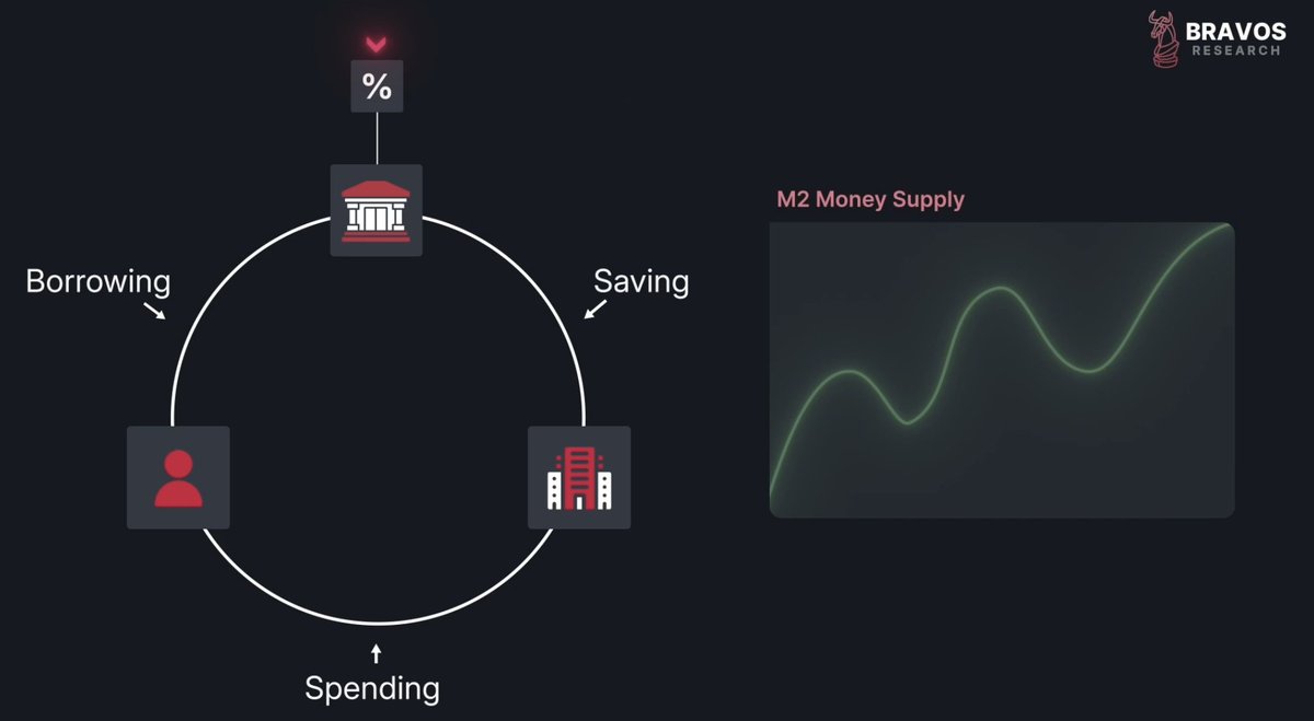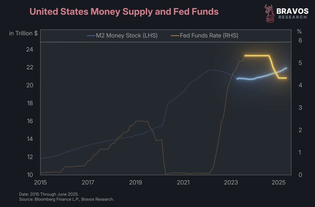 And when we put the Fed Funds Rate on top, we see this decline in money supply coincided with the Fed aggressively raising rates and tightening conditions