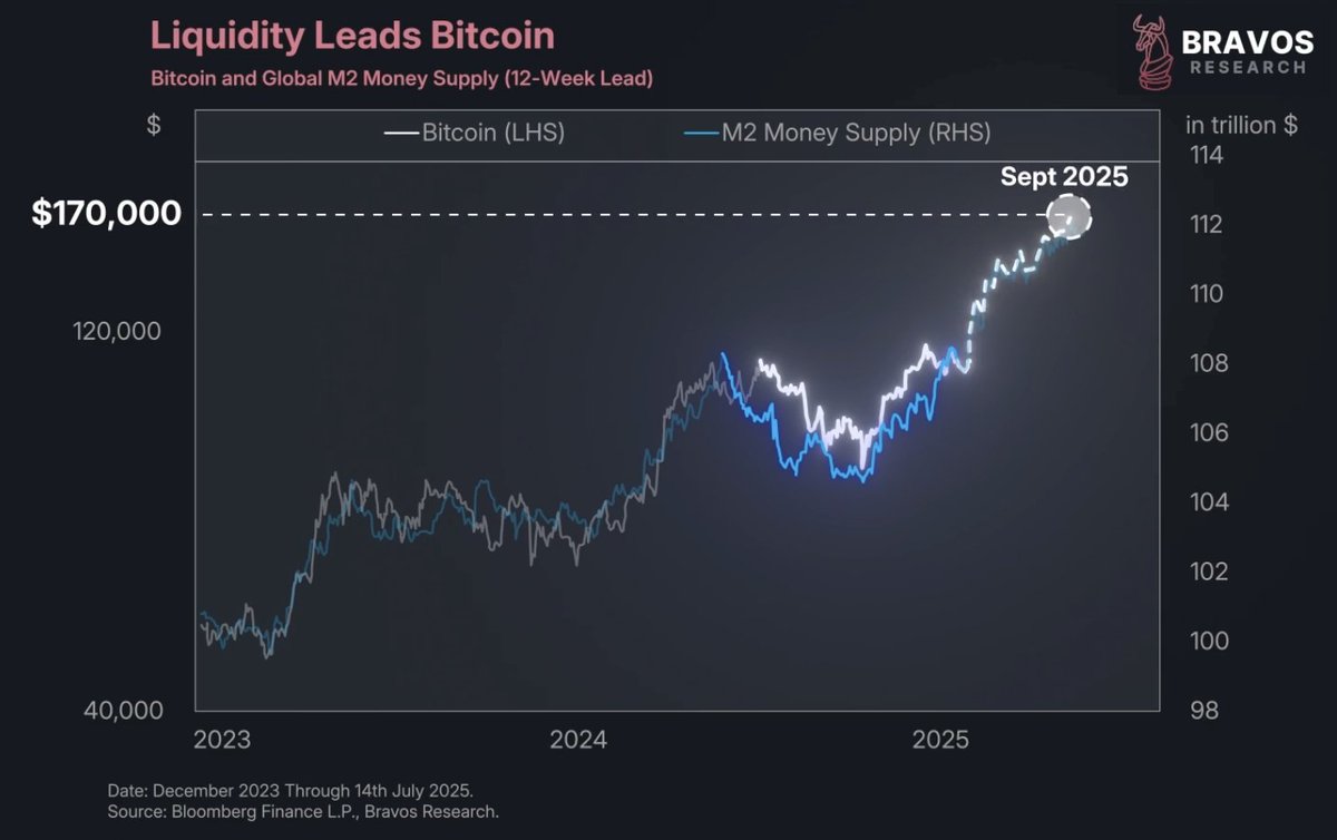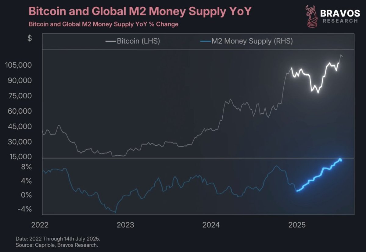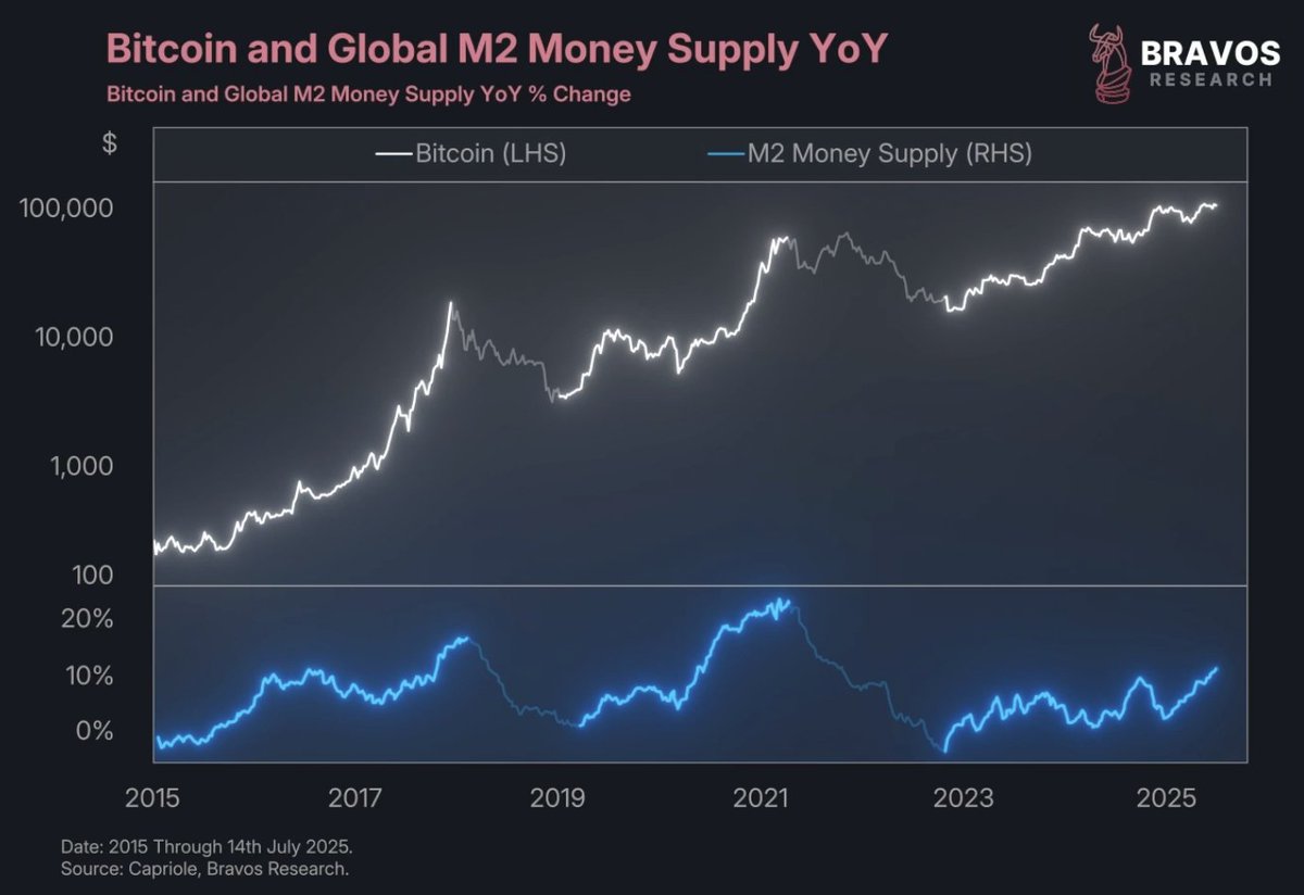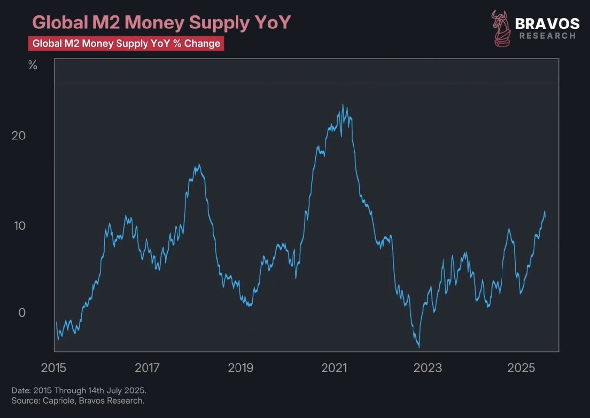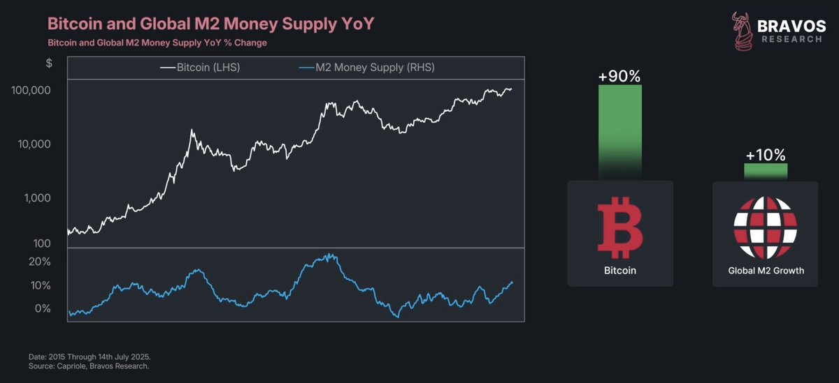 That means a 10% rise in global M2 has historically led to a 90% gain in Bitcoin