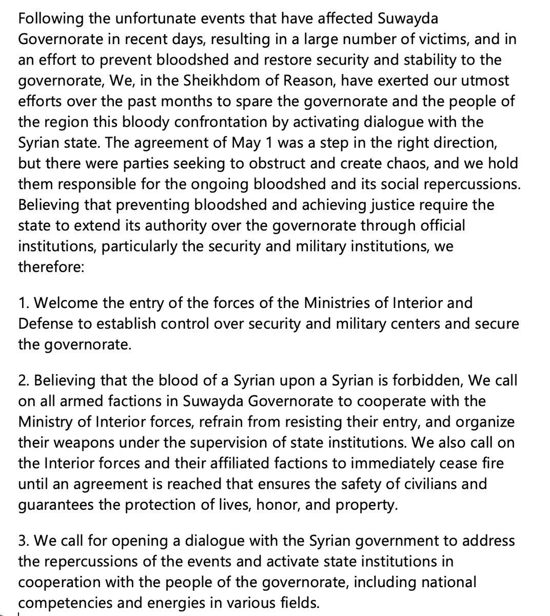 However, for a 2nd time in 24hrs, Hikmat al-Hijri announced his rejection of the ceasefire deal agreed by all other #Suwayda #Druze leaders & called on his fighters to continue fighting.
