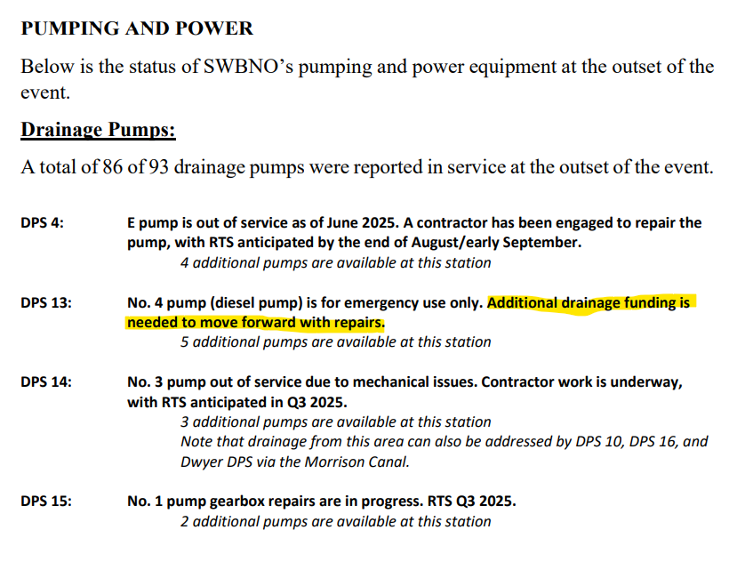 It is important not to focus on how many pumps @SWBNewOrleans claims are "available." That only means that pumps can be run without any load. It says nothing of how they will perform in a storm. On average, 20-25 pumps go down for some period during a typical big storm. (13/22)