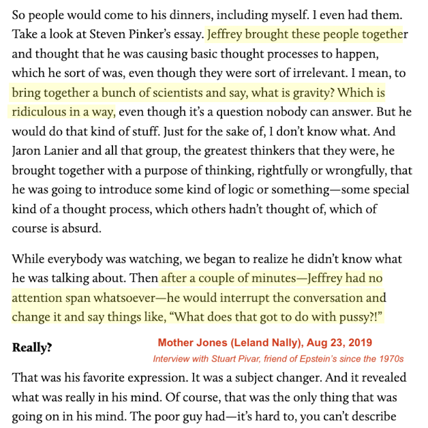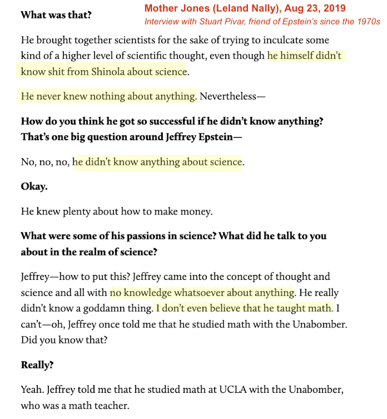 Epstein was no genius: Pivar describes the 'science parties' Epstein threw for famous professors from MIT and Harvard, and says Epstein "didn't know shit from Shinola about science", had "no knowledge whatsoever about anything". And yet he got hired at Dalton. 4/