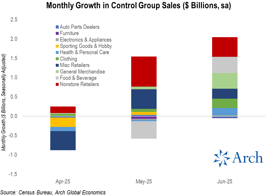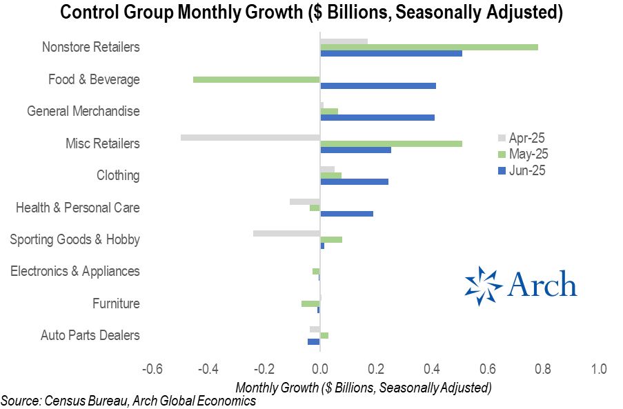 June Retail Sales beat expectations up 0.6% m/m (0.1% consensus), with Control Group (which feeds directly into GDP) also up 0.5% vs expectations for a 0.3% gain.