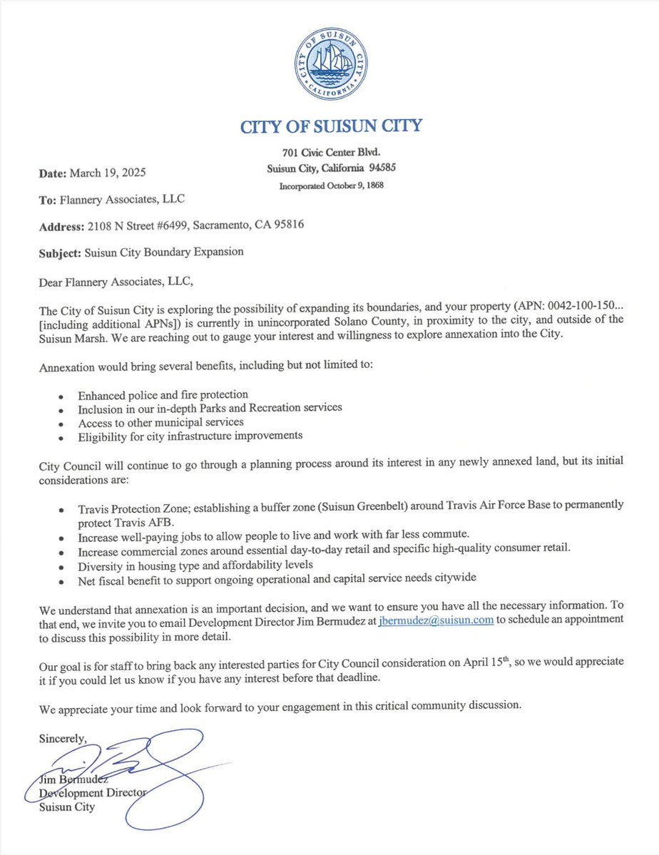 This also solves a generational problem for Suisun – at 4 square miles, they’re Solano’s smallest city by area, and have been landlocked for decades, closed off from growth and opportunity. Their only path to grow was east, but you can’t build that close to Travis AFB, America’s Gateway to the Pacific.
