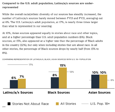/5 NPR is committed to matching the demographics of its news sources to the United States adult population — not the real world availabilty of diverse or on-point sources.