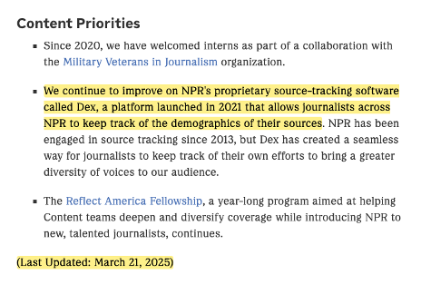 /2 Focused on “inclusive storytelling” (instead of “accurate reporting”), NPR tracks the demographics of its news sources in order to achieve its “newsroom mission” “to look and sound like America.”