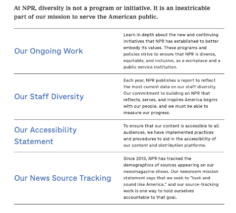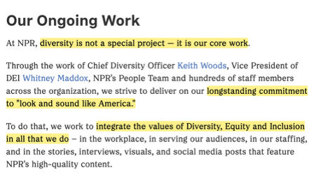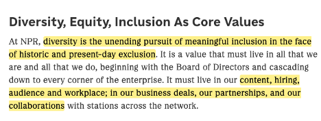 /9 Diversity, Equity, and Inclusion — including race considerations — are “Core Values” that NPR allows to influence its HIRING, AUDIENCE, and WORPLACE.