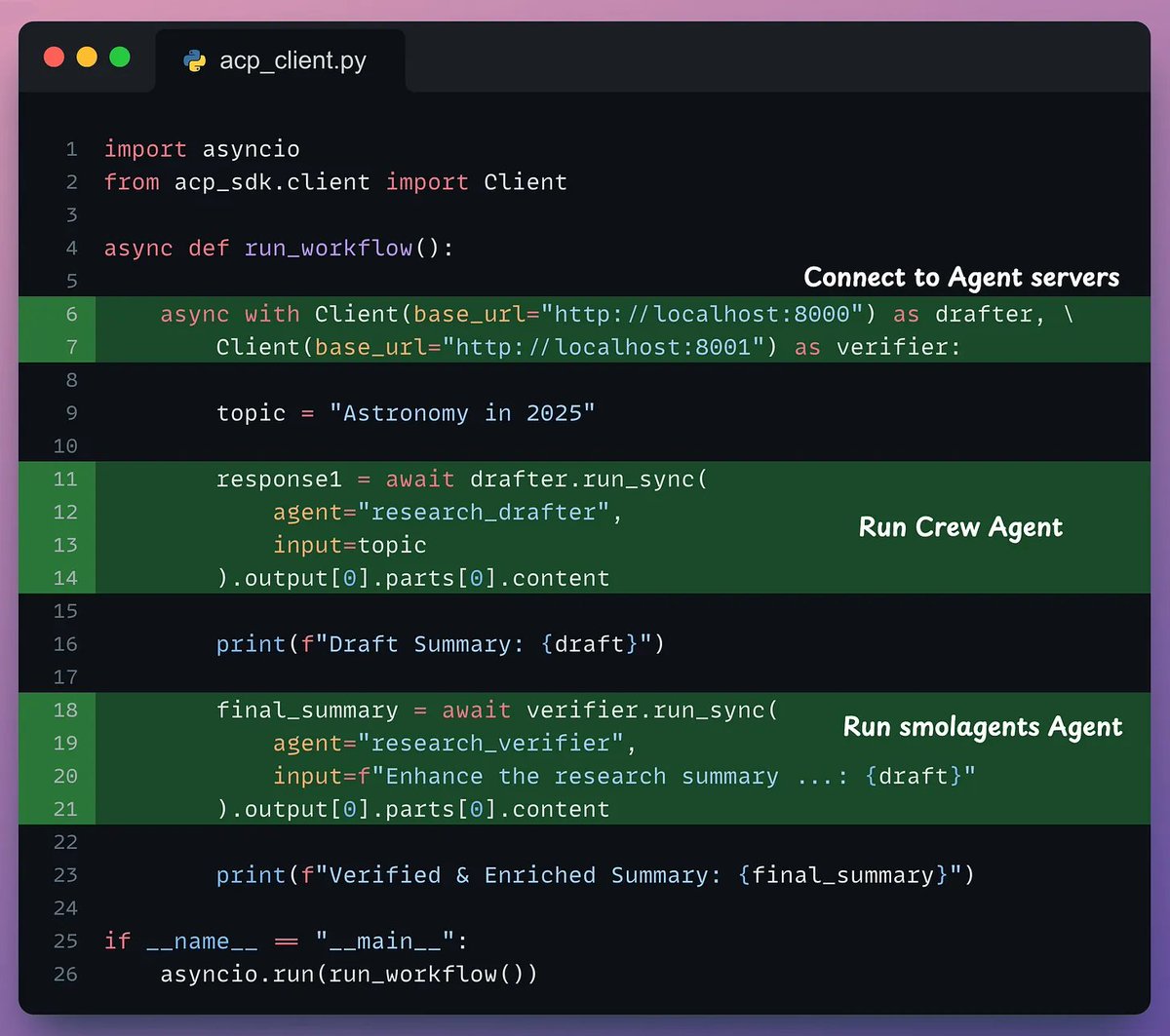 Finally, we use an ACP client to connect both agents in a workflow.