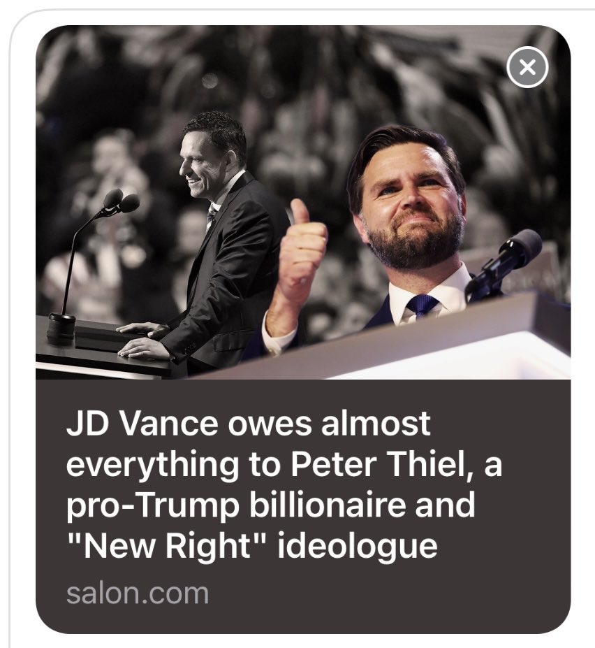 @MattGoldstein26 4/ “JD Vance owes almost everything to Peter Thiel, a pro-Trump billionaire and “New Right” ideologue” 7/22/24 salon.com/2024/07/22/jd-…