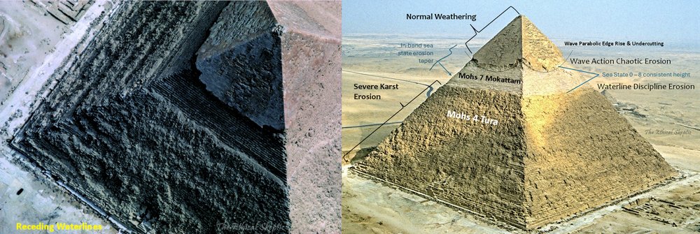 In the ECDO theory developed by @EthicalSkeptic there is substantial evidence presented suggesting that the Pyramids of Giza were once covered by saltwater for a prolonged period, which is the primary reason they appear to be eroded by water.