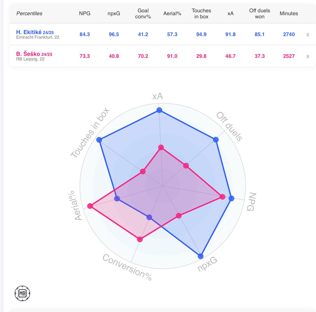 2. Looking at the other sought after ST from the bundesliga, you can see that Ekitike has higher percentage of duels, touches in box, NPG, but also chances created. Sesko is better in the air, and a slightly higher conversion rate, but overall Ekitike exceeds in most areas.