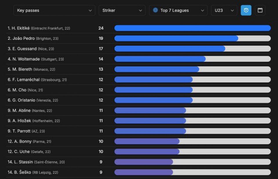 Amongst all U-23 strikers, Ekitike made the most key passes. Essentially, Ekitike is showing his ability to take on shots and make it difficult for the keeper, but also create goal scoring opportunities for his teammates as needed.