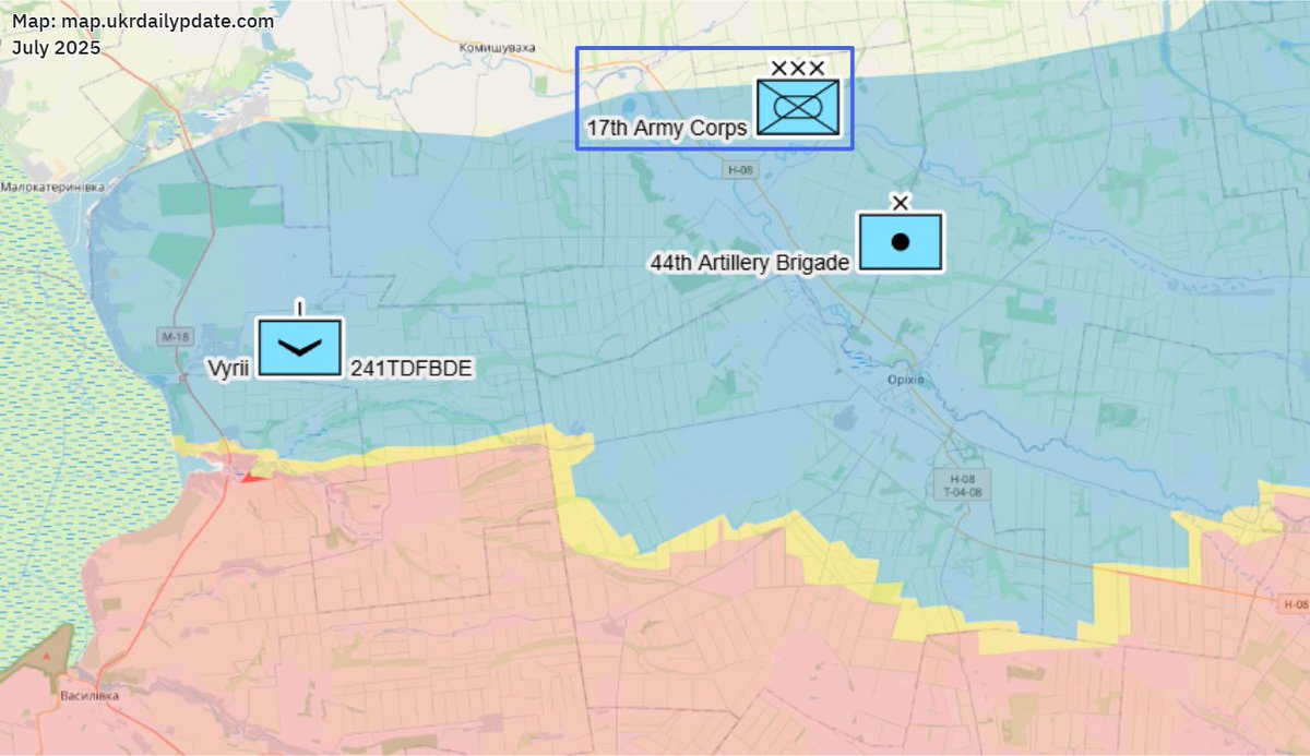 The Ukrainian 17th Army Corps (17AK) has likely deployed to the front, replacing the Operational Tactical Group (OTU) Zaporizhzhia.
