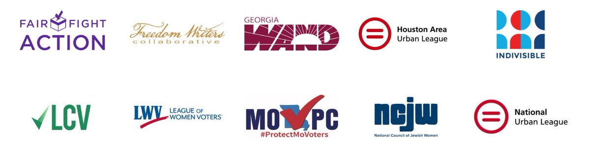 ... Fair Fight Action, Freedom Writers Collaborative, Georgia Wand, Houston Area Urban League, Indivisible, League of Conservation Voters (LCV), League of Women Voters (LWV), Missouri Voter Protection Coalition, National Council of Jewish Women (NCJW), National Urban League...