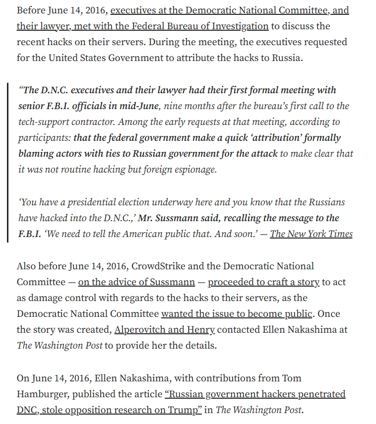 The DNC CrowdStrike story was all rubbish as the DNC people tried to push for the FBI to say that Russia did it, another thing to keep in mind. Michael Sussmann, with Ellen Nakashima being specifically used by Dmitri Alperovitch and Shawn Henry to push it.
