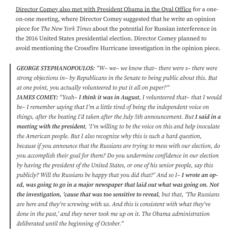 James Comey said he met with Obama in the Oval Office in August 2016 and suggested he would write an op ed about Russian election interference.