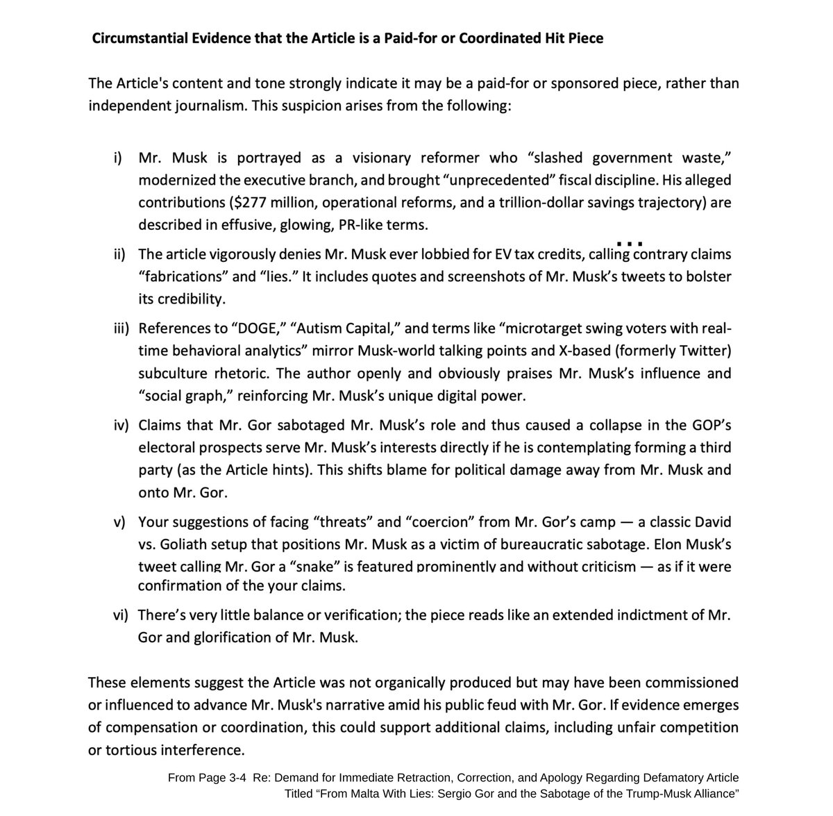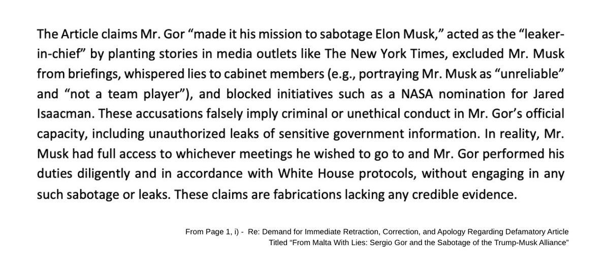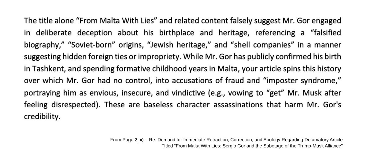LAWFARE🧵8/9: Gor’s lawyer closes his demand letter with a final flourish of paranoia, suggesting that my op-ed wasn’t independent journalism at all, but some kind of paid-for or sponsored piece. His “evidence”? That I respect Elon Musk. That I embedded X posts in the piece. And that the op-ed indicts Sergio Gor while praising Musk.