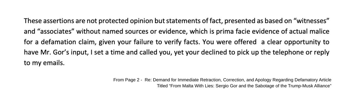 LAWFARE🧵2/9: Sergio Gor's lawyer, Robert Garson, is demanding that I remove the op-ed from 𝕏, issue a full retraction falsely claiming the article contained false statements about Gor, and issue a prominent apology on 𝕏 and in a local newspaper expressing regret for the harm I caused Gor, including emotional distress.
