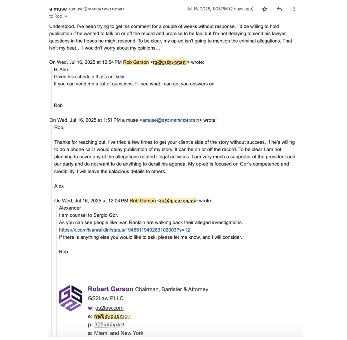 As I wrote in the op-ed: "And when anyone speaks out, retaliation follows. Gor believes his power in Washington DC is at its apex after publicly running Elon Musk out of the White House. In over a dozen interviews with Gor’s associates and acquaintances, every single one requested anonymity, fearing professional or personal repercussions. Reporters I’ve spoken with who merely asked questions about Gor describe a rapid response: their voicemail and email suddenly flooded with Washington operatives attempting to kill their story. When I began work on this article, I received emails and phone calls from Gor’s lawyer, Rob Garson. I offered to delay publication to give Gor the opportunity to provide his side of the story. Garson, however, insisted I send questions that he would 'try' to get answered by his client, an offer that rang hollow. The tone and timing of the outreach made it clear: this was not a dialogue, it was a threat."