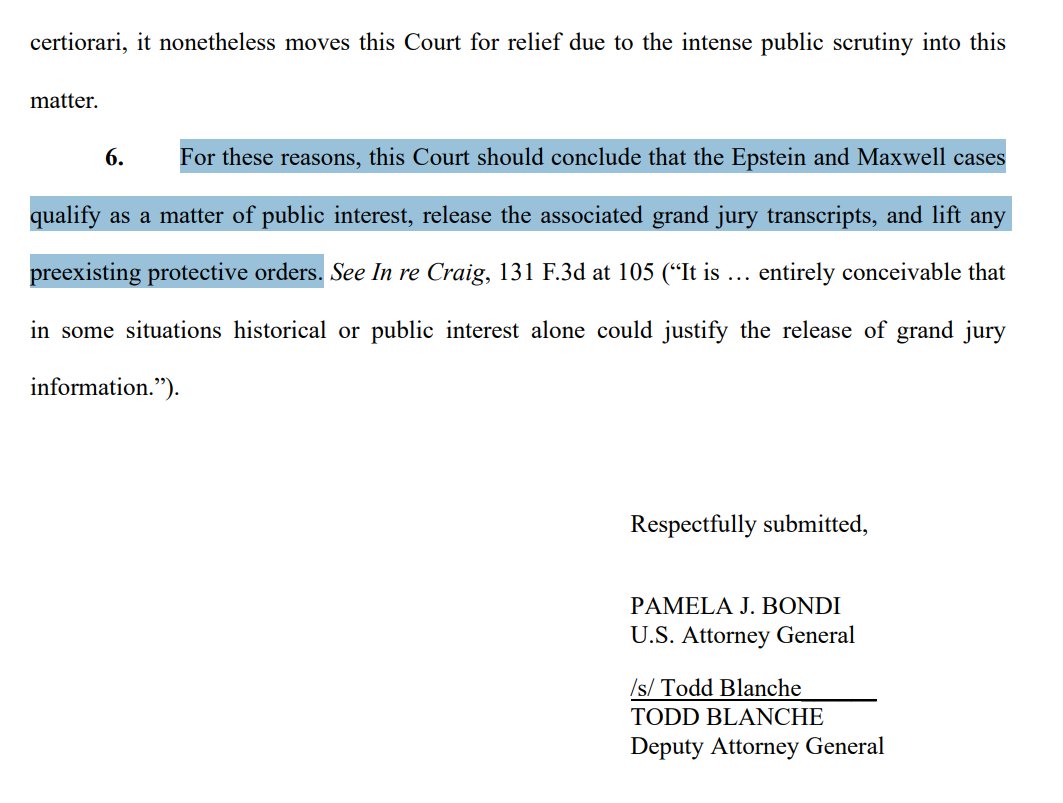 AG Bondi and Deputy AG Blanche have today filed a motion in this case to unseal grand jury transcripts. Image