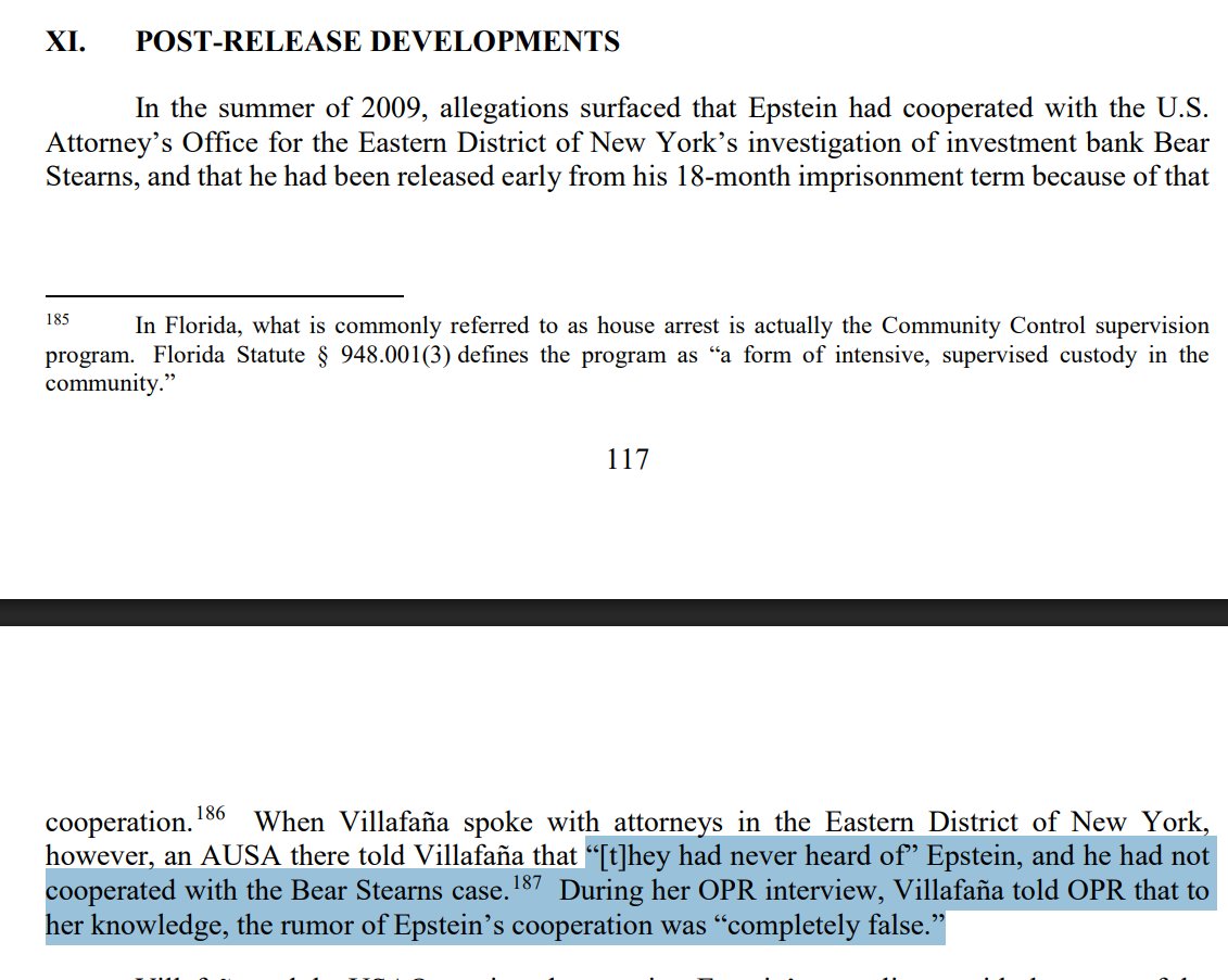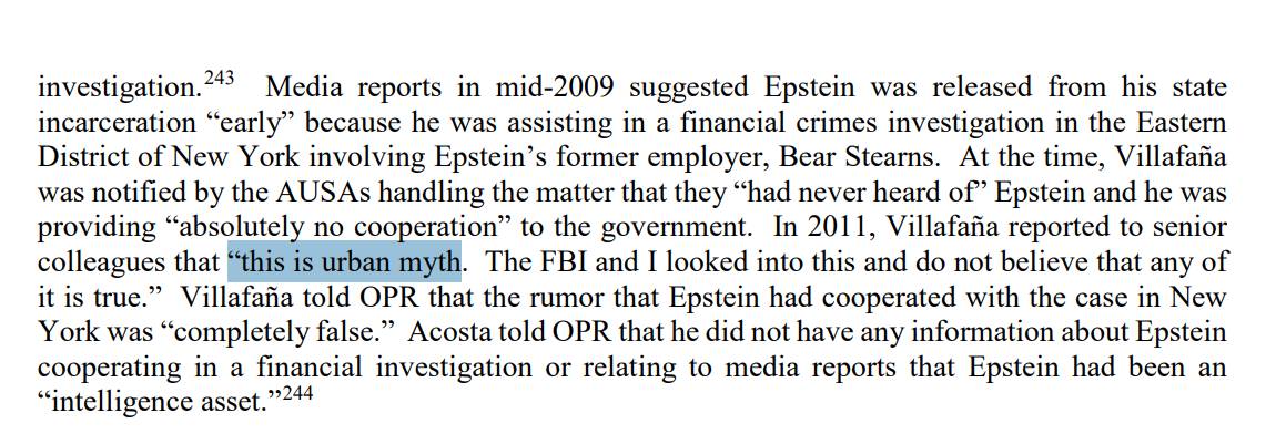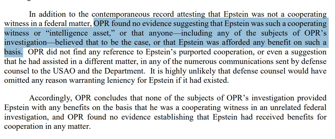 "In addition to the contemporaneous record attesting that Epstein was not a cooperating witness in a federal matter, OPR found no evidence suggesting that Epstein was such a cooperating witness or “intelligence asset,” or that anyone—including any of the subjects of OPR’s investigation—believed that to be the case, or that Epstein was afforded any benefit on such a basis."Image
