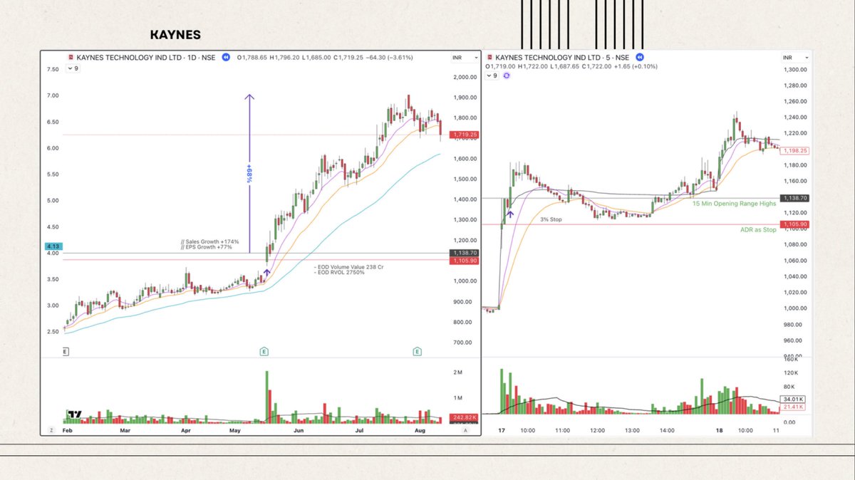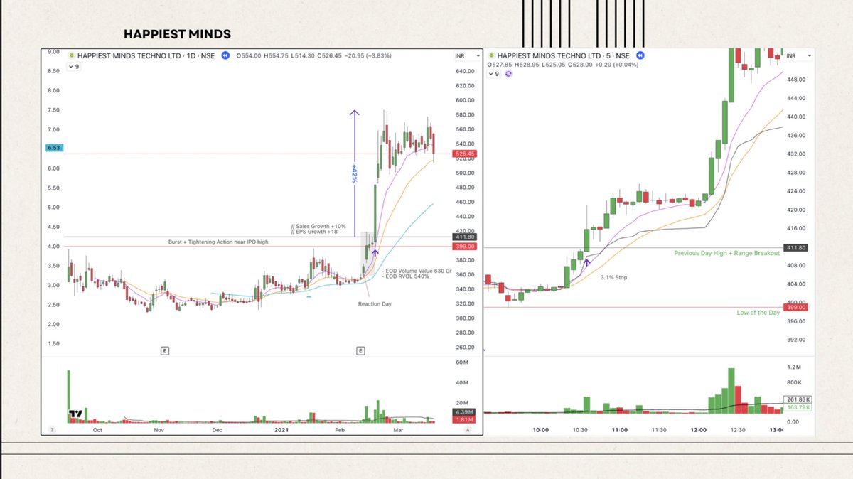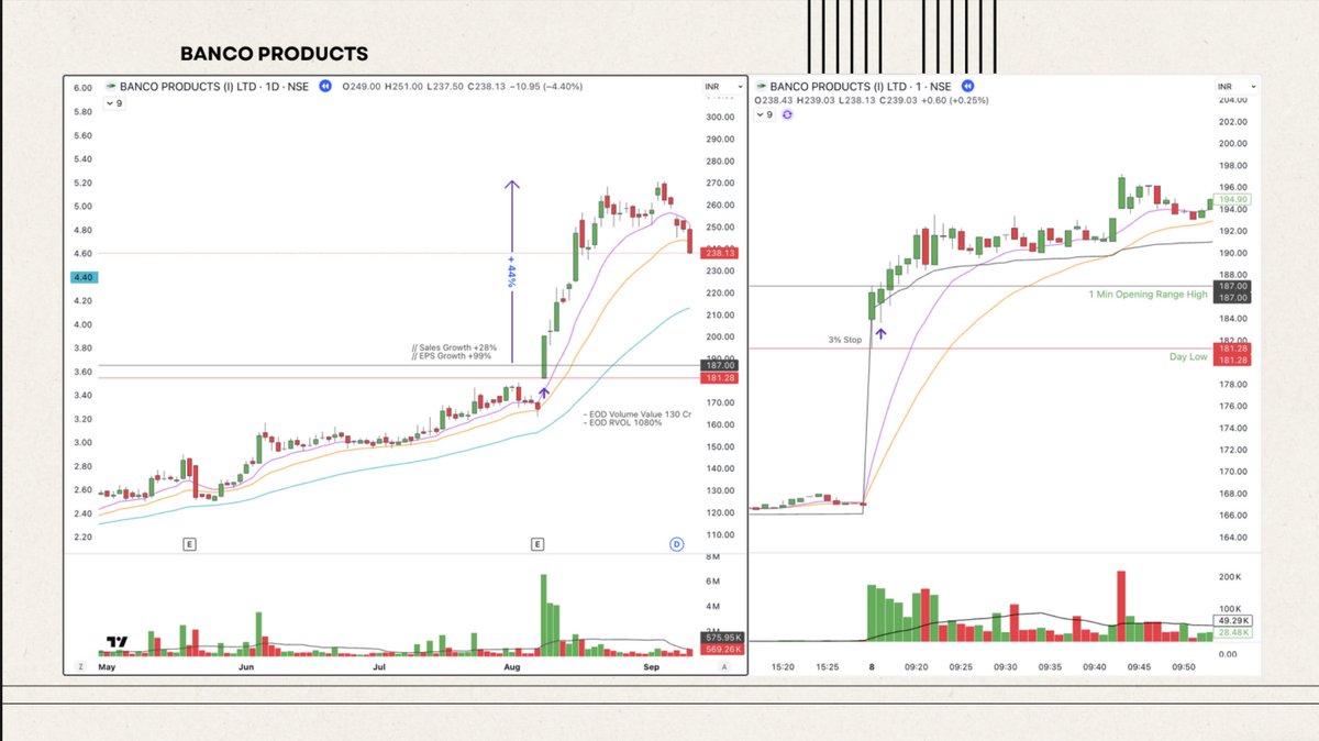 The stock opens with a gap-up, sees a powerful start with exceptionally high volumes, and follows through immediately.