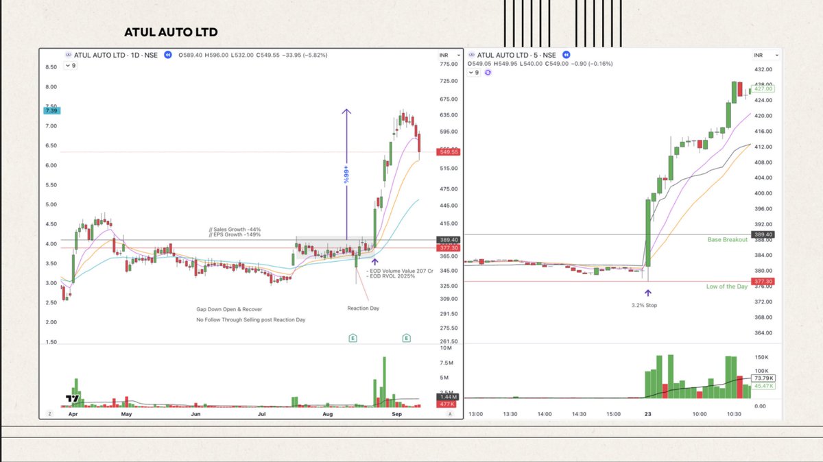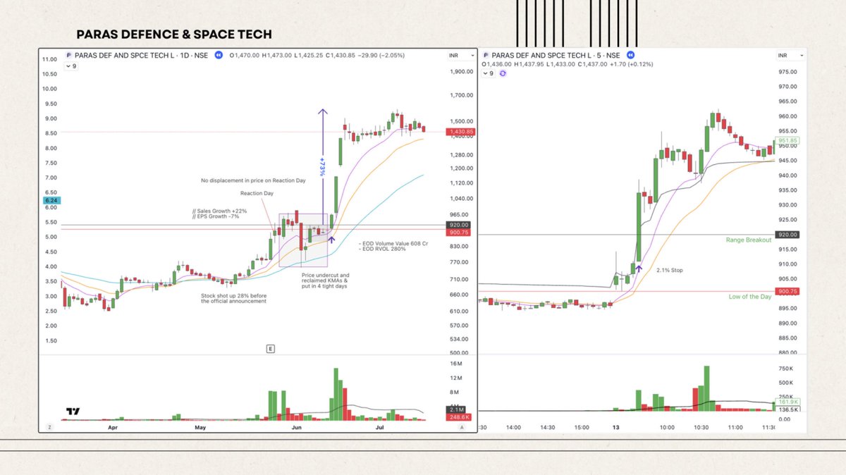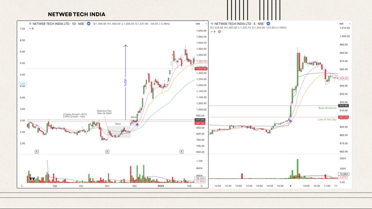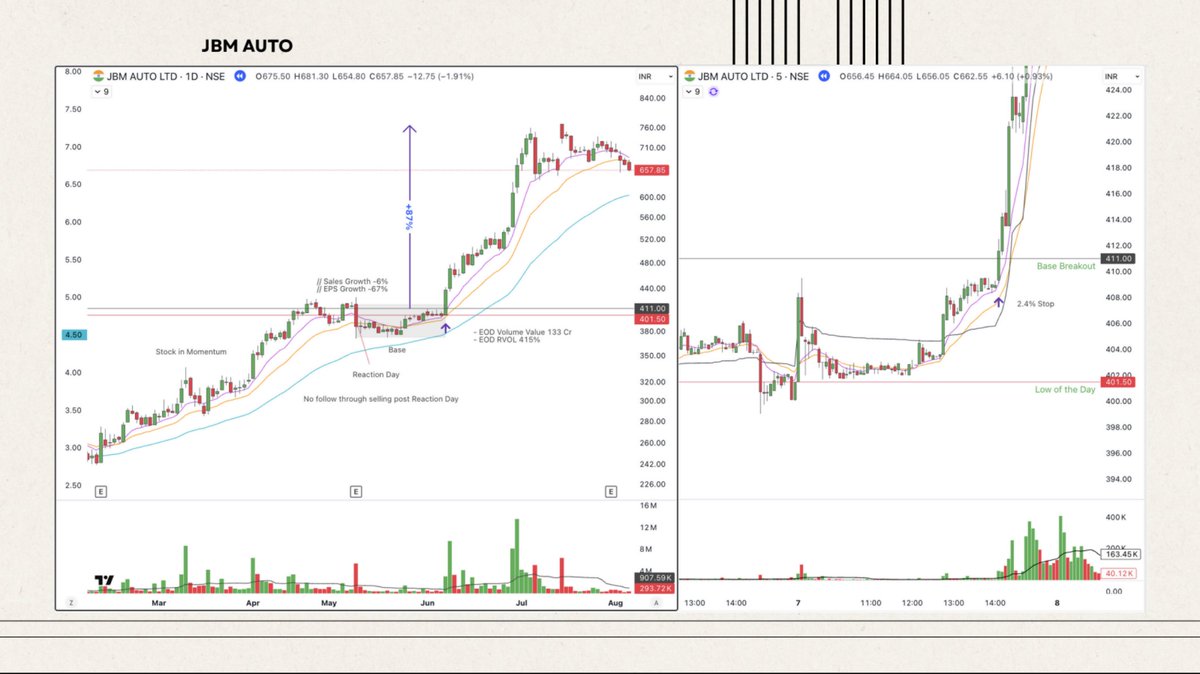 The stock surges sharply on the reaction day and then consolidates over the following weeks. If it shoots up immediately, the initial move can often be missed - but the subsequent basing phase attracts fresh demand and sets up a more structured entry.