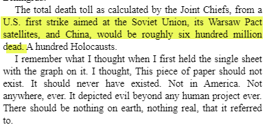 3/6 in "The Doomsday Machine" Pentagon whistleblower Daniel Ellsberg reveals that in case the US went to war with the Soviet Union, America's Single Integrated Operational Plan (SIOP) called for preemptively nuking every major city in China as well - estimating 600 million dead