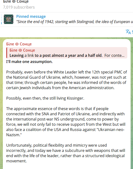 3/ In a post from a few minutes ago, White Sun claims that if Biletsky's radical neo-nazi movement comes to power, 'GloboShlomo' (the US + Russia) will unite to destroy it