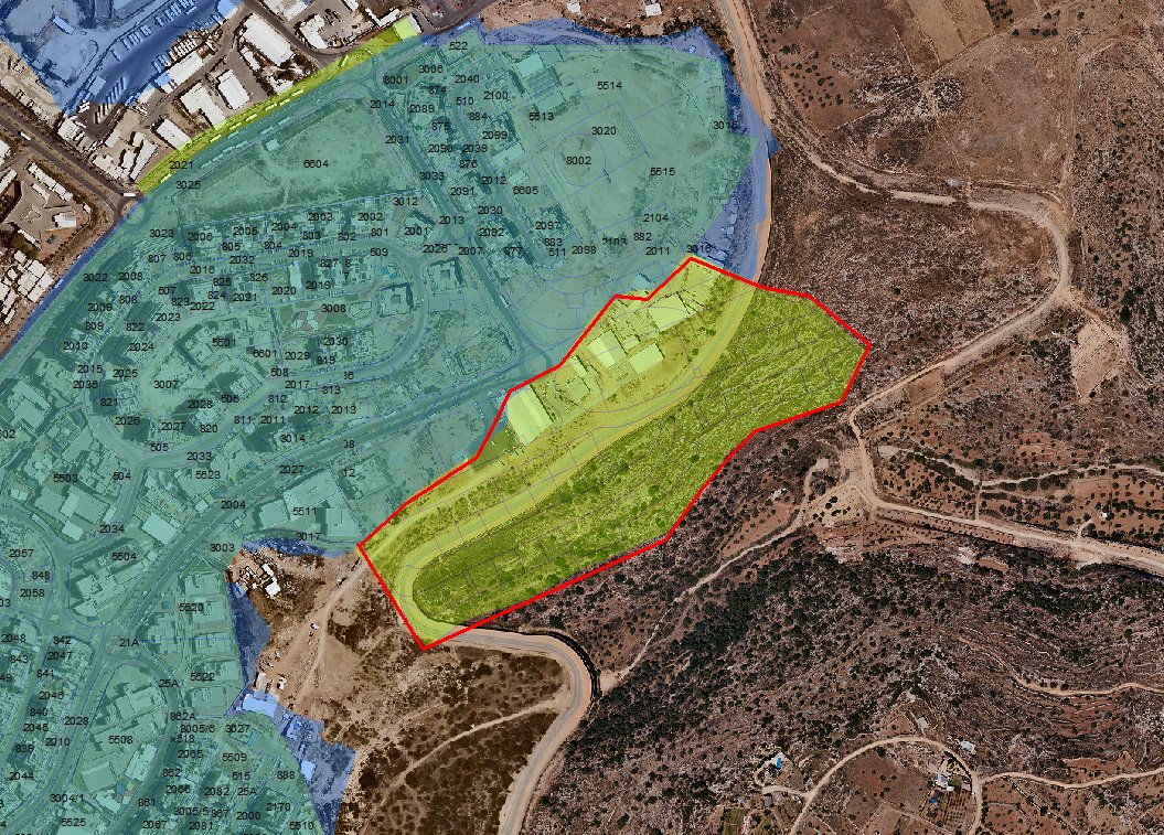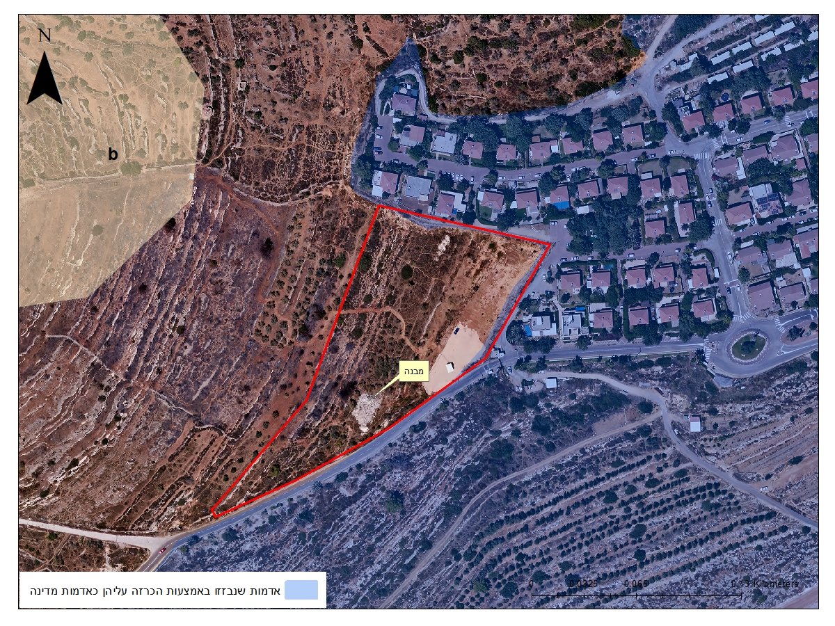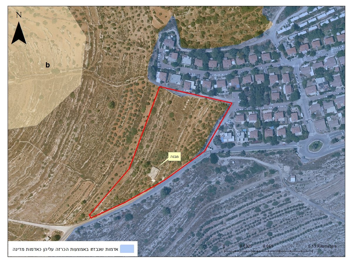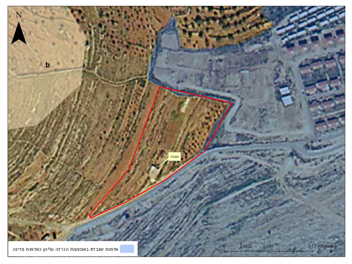 אהמהמה, בשנת 2010 נעשה שם מיפוי של אדמות מדינה (מה שנקרא "קו כחול"), והתברר שכ-80 דונם בפינה הימנית התחתונה הם למעשה לא אדמות מדינה. אני מדבר על האזור הצהוב שמוקף בקו אדום. הנחש הלבן שמתפתל מצד ימין זו גדר ההפרדה. אלו הכל אדמות שנבזזו מהכפר ח'רבתא, שנמצא מימין מחוץ לפריים.
