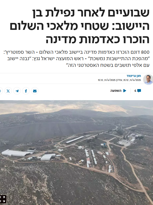 2. לפני חודש סמוטריץ הודיע כי הוכרזו 800 דונם באזור המאחז האולטרה אלים ומבודד "מלאכי השלום". אבל עד לפני 3 ימים לא התפרסם שום מסמך רשמי שממנו ניתן ללמוד מה בדיוק כלול בשטח ההכרזה. שימו לב לתאריך הפרסום: 7.7.2025. נחזור לזה.