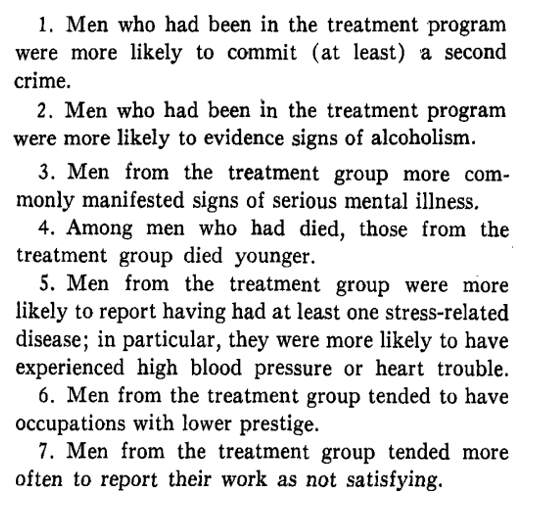 However, when he looked as objective measures of criminal behaviour, death, disease, occupational status, and job satisfaction, the program appeared to have a clear *negative* effect. Technically, this is known as an 'iatrogenic' effect.