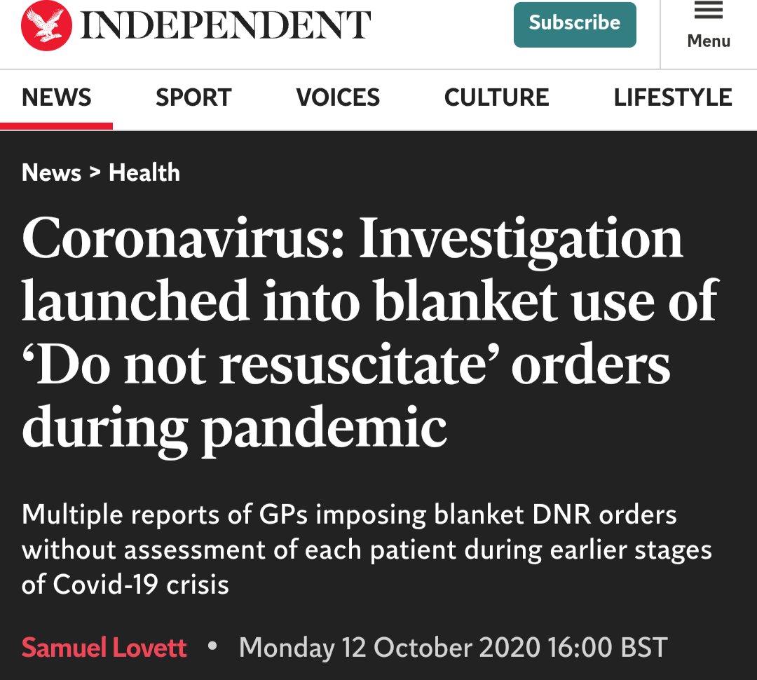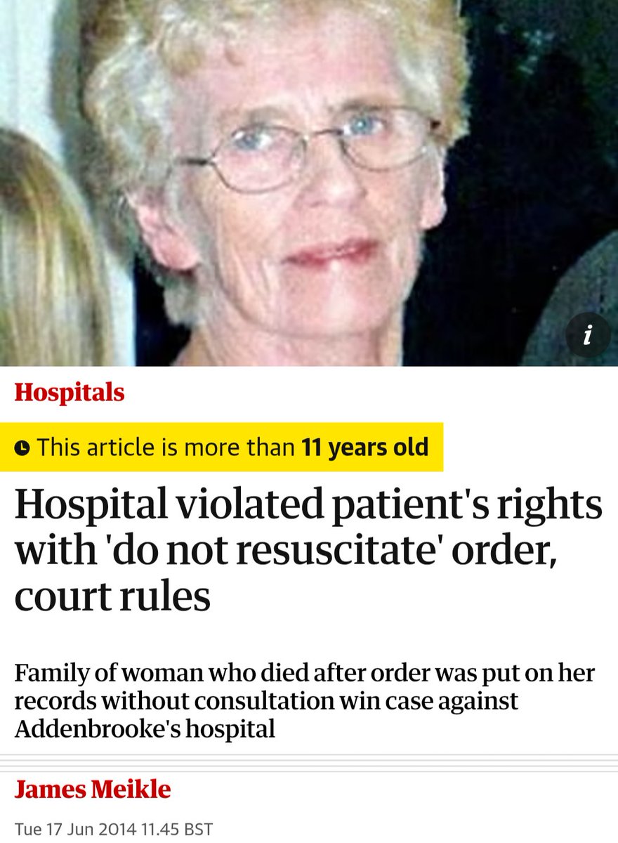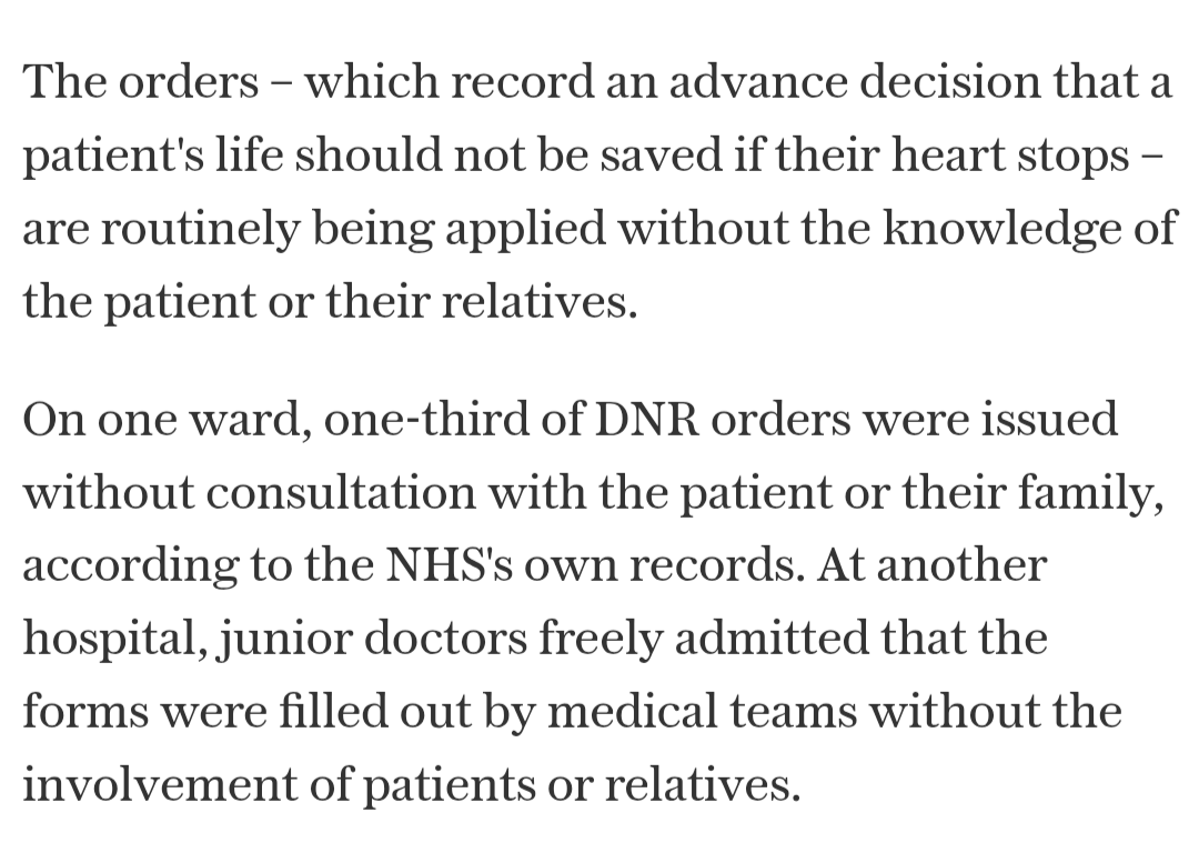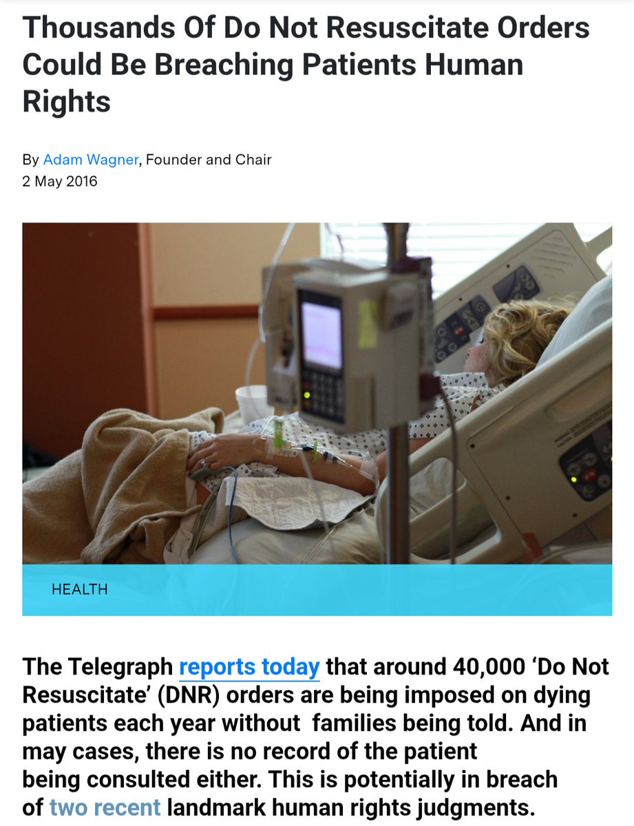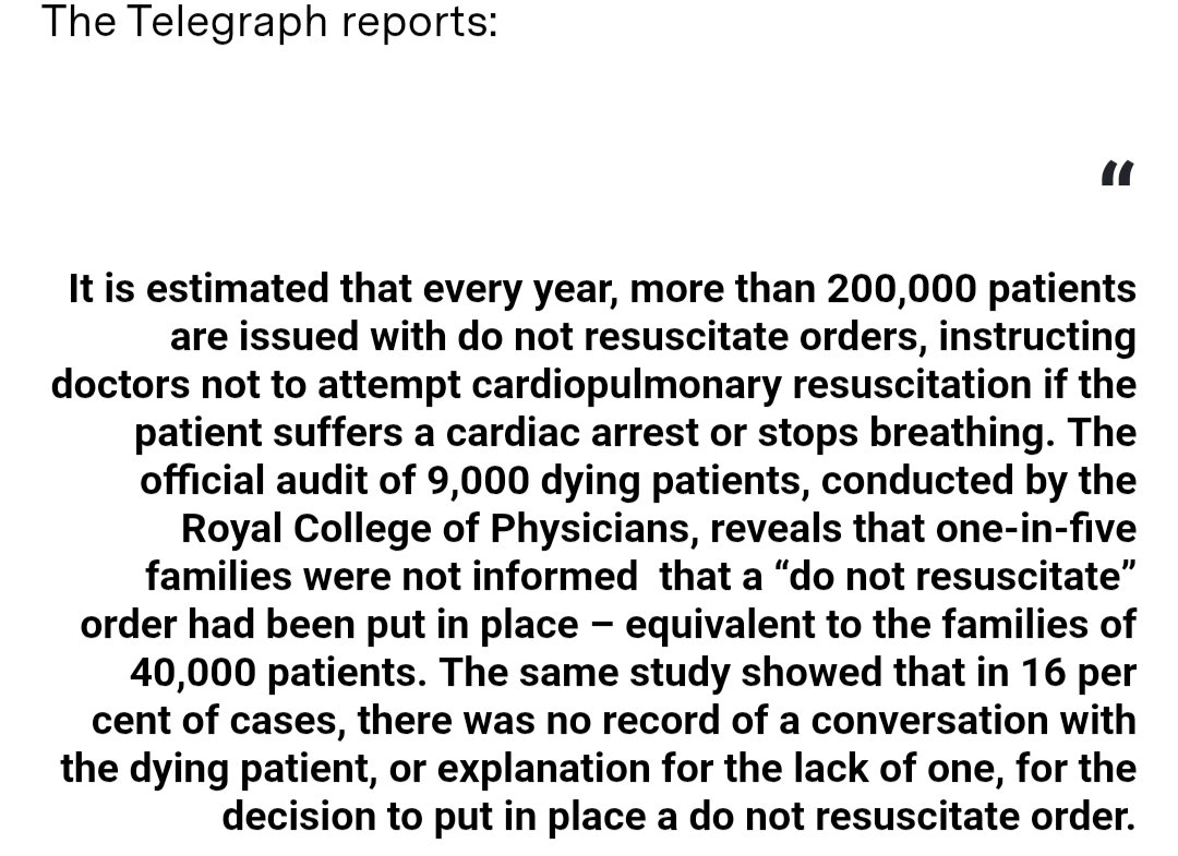 2016 - "40,000 DNR Orders are being imposed on dying patients each year without families being told.And in many cases there is no record of the patient being consulted either". eachother.org.uk/thousands-not-…