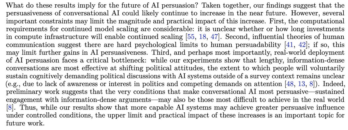 Taken together, our findings suggest that the persuasiveness of conversational AI could likely continue to increase in the near future.