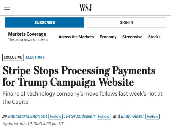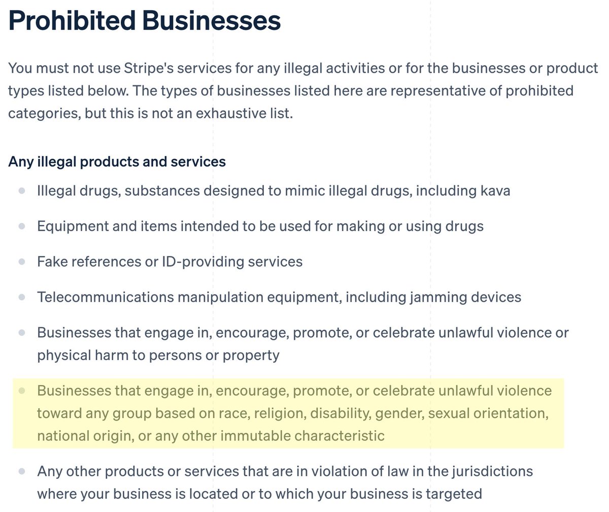 9/ Since I haven’t been distributing fake IDs, selling drugs, or jamming telecommunications equipment, it seems Stripe concluded that my political opinions had somehow violated their policy against encouraging “unlawful violence” against certain demographics.