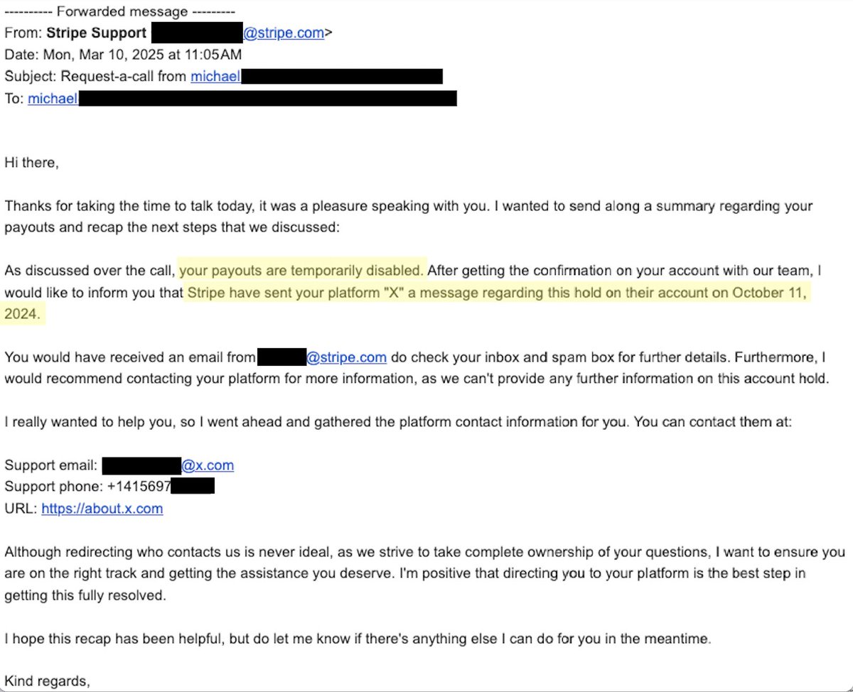 4/ While I worked on reaching out to X, I called Stripe. They confirmed that my payouts were “temporarily disabled” but again insisted they would only share the details of this “hold” with X—not me, whose money they were holding.