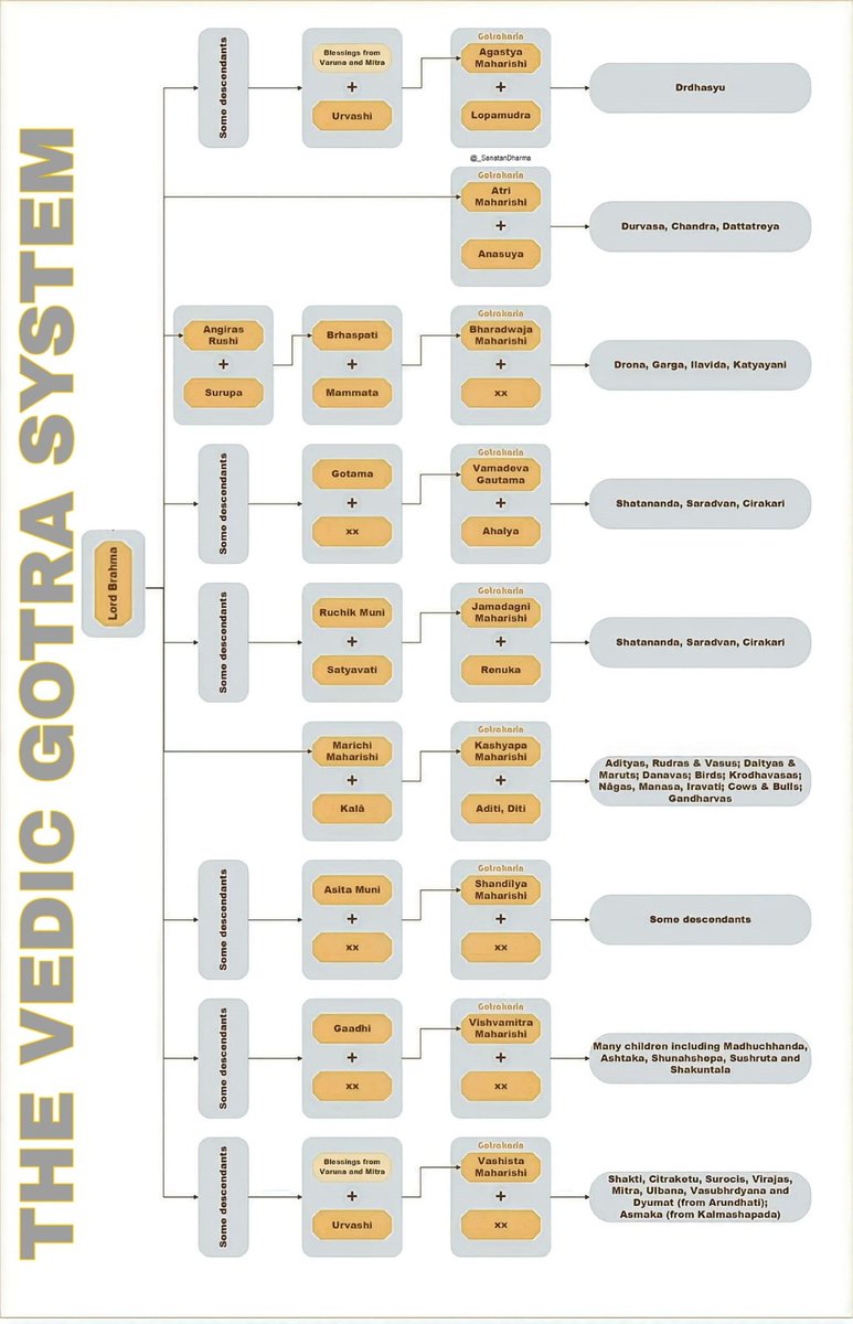 At the top is Lord Brahma, the creator. From him, great sages (Maharishis) were born-each becoming the father of a Gotra.