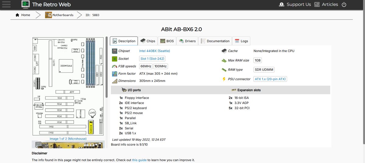 As such, I've moved on to the CompUSA PC. It has an Intel SE440BX-2 motherboard. Oh, here we go again, that i440BX chipset. Also, looks like the manual and The Retro Web disagree here on max memory, but I bet with the right kind of 256MB chips, we could hit 768MB.