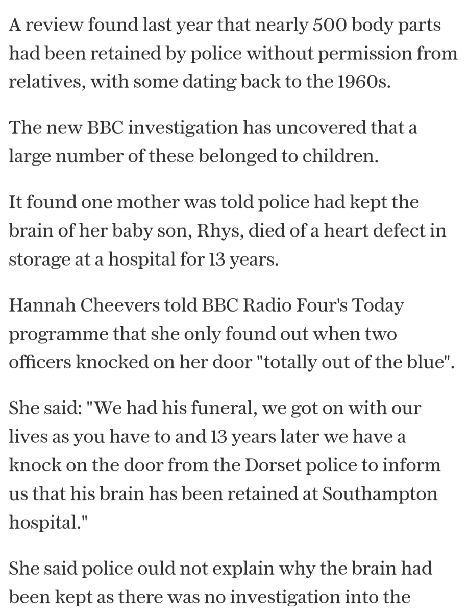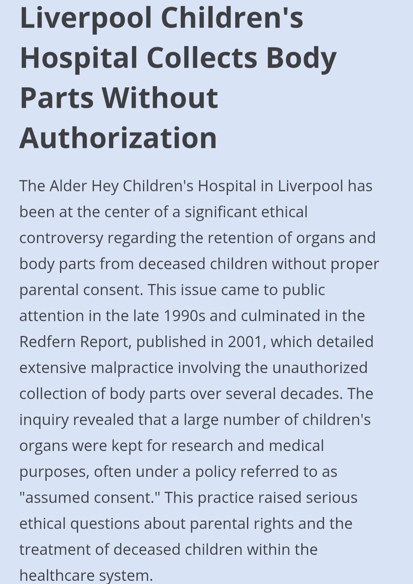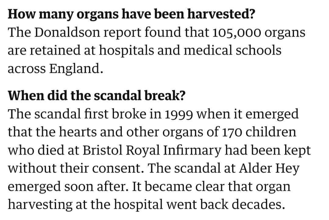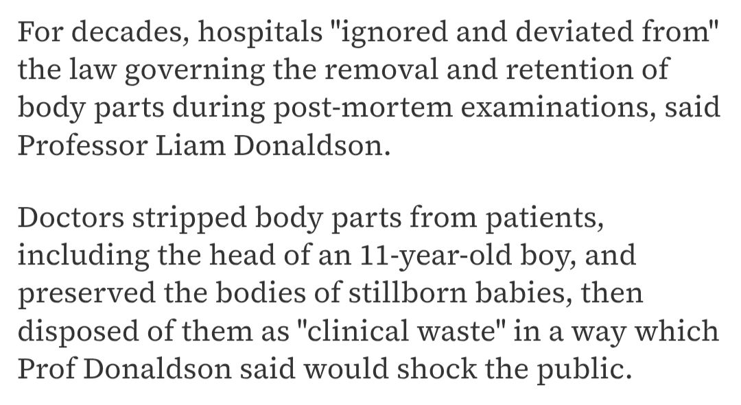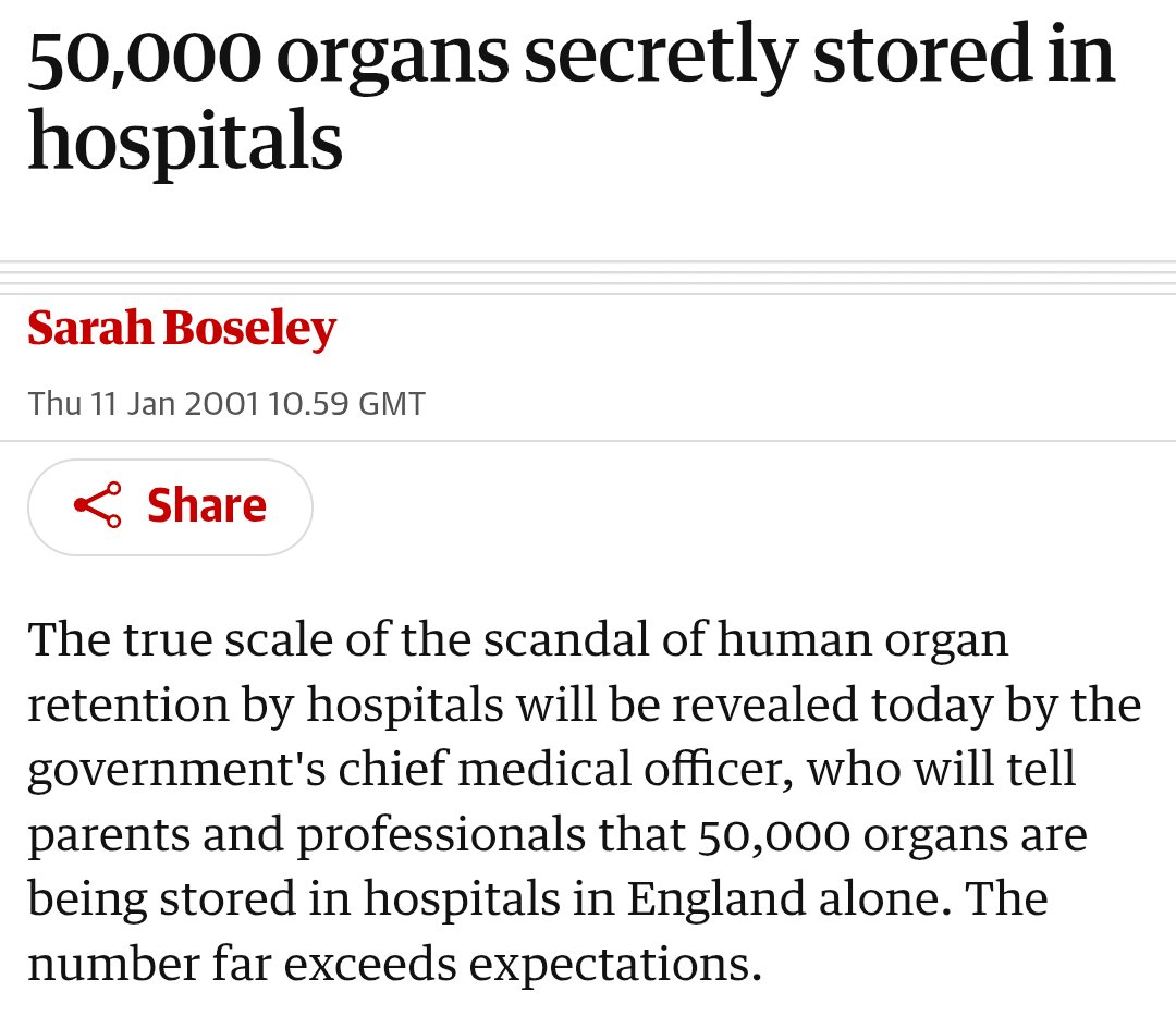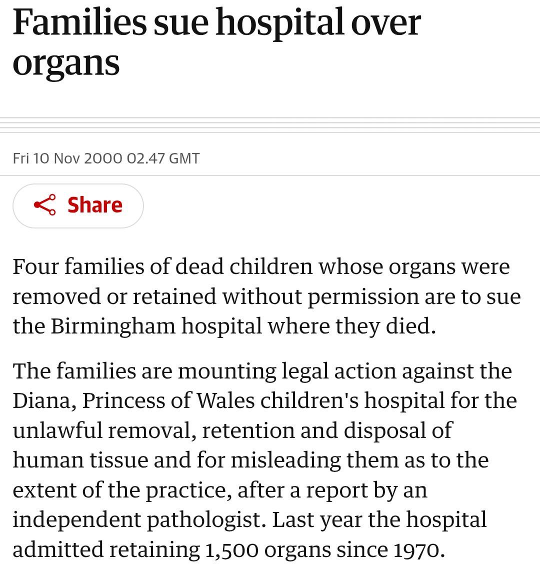"Three children's hospitals had been harvesting hearts,lungs,brains & other organs from dead babies without their parents consent" theguardian.com/society/2001/j…