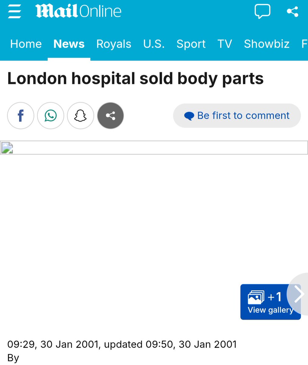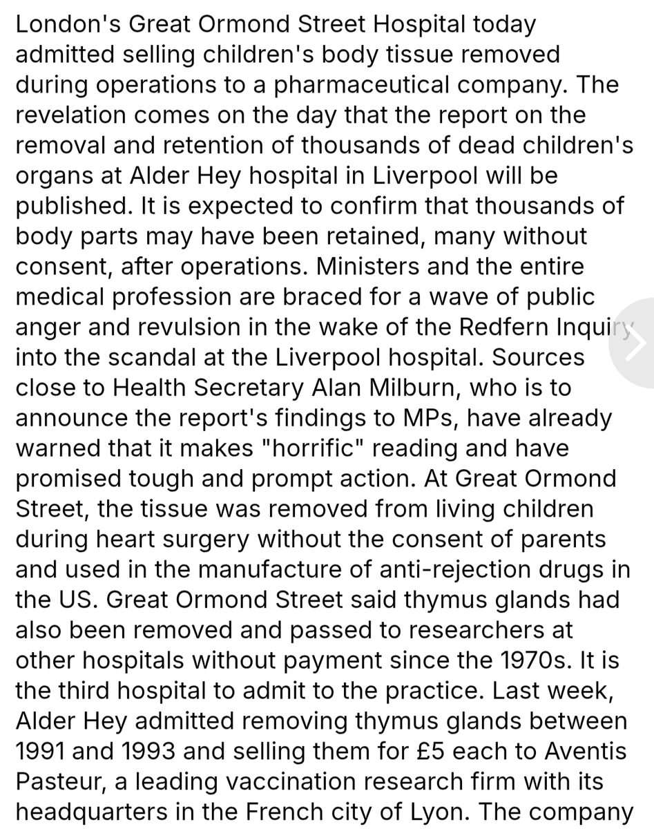 "London's Great Ormond Street Hospital today admitted selling children's body tissue removed during operations to a pharmaceutical company." dailymail.co.uk/news/article-1…