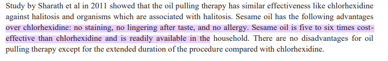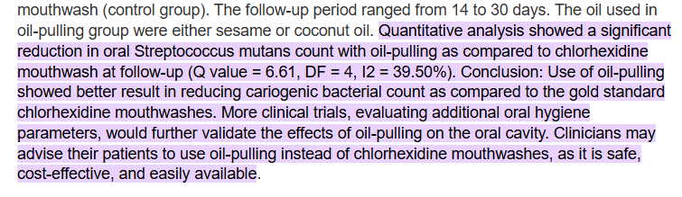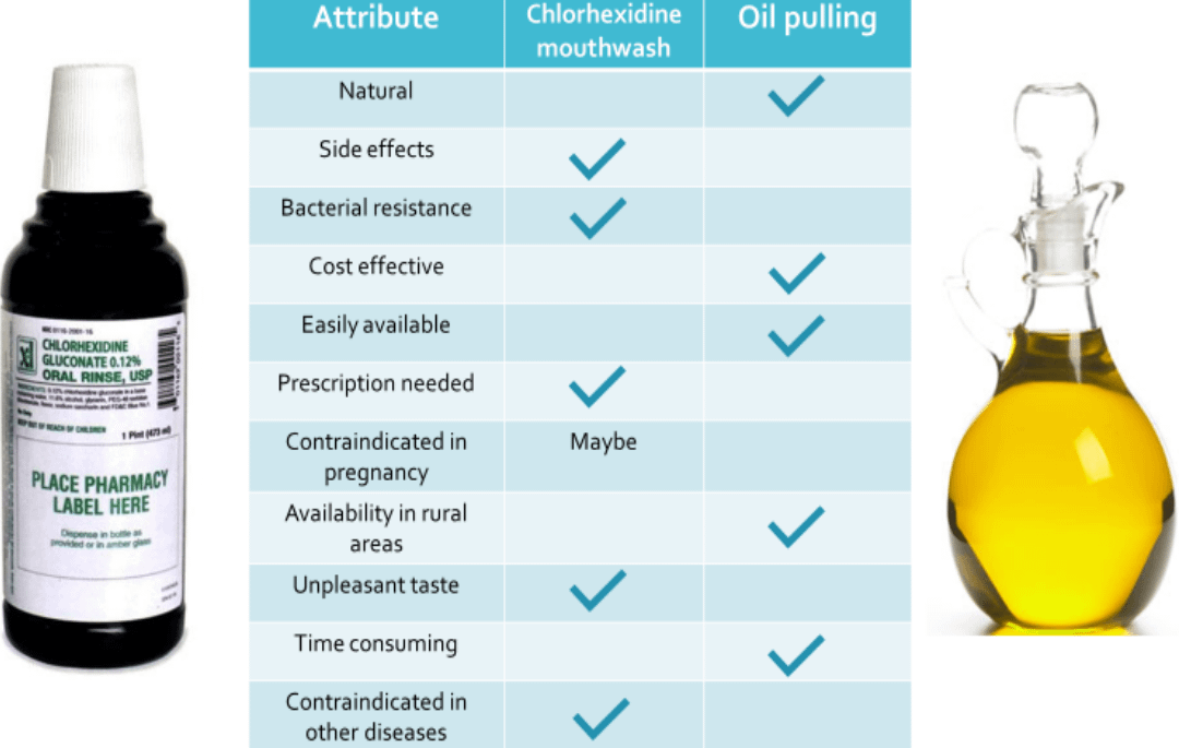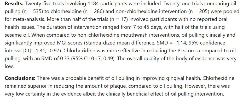 A 2024 meta-analysis of 25 studies (1,184 participants) compared oil pulling with chlorhexidine mouthwash, the current “gold standard” antiseptic.