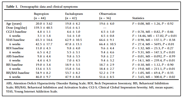 Participants receiving bupropion had significantly greater reductions in CGI-S and YIAS scores compared to both escitalopram and observation.