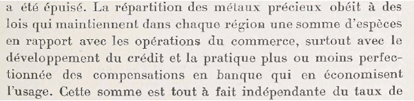 "The distribution of precious metals obeys laws that maintain in each region a sum of cash in relation to (international) commercial operations, especially with the development of credit and the more or less perfected practice of bank clearings which economize on its use."