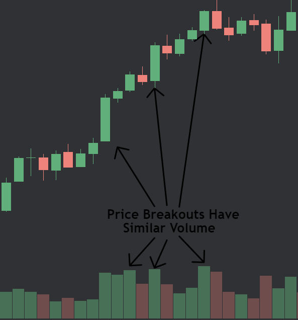 1) Volume surges are paired with lower volume red candles 2) Breakout candles pair higher volume with larger candles 3) The volume is consistent and sustained