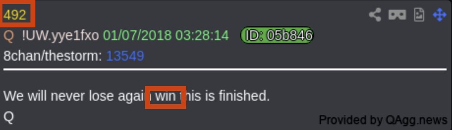 🧵/4- Now the other thing we look for is misspellings, this will come in to play here, and will come into play several times later so follow along. @ 03:28 am, Q drops post #492(picrel), now the previous post had 3 [15]'s in it, and the post dropped in the 3am hour is #492 or 4+9+2=[15] and this post includes a misspelling that will again come into play later in a big way. This misspelling in WIN, and it should be WHEN, and it goes - "We will never lose again WIN this is finished". OK so now that takes us to 2 tweets by Trump.
