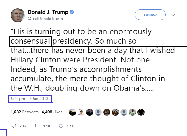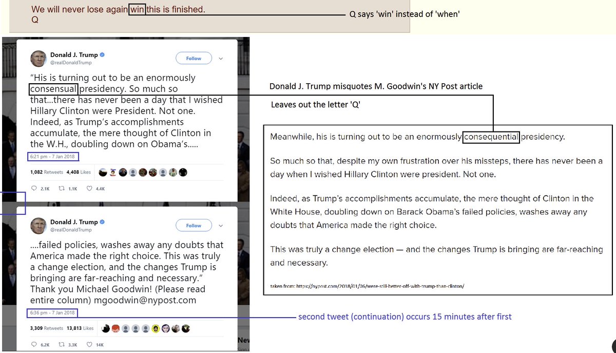 So in the first post Trump misspell's a word, that word just happens to involve a missing Q👀. He spells consensual, instead of the word consequential. Trump then waits exactly [15] mins till 21:36ET to post the 2nd part , which is an OBVIOUSLY a long time, & that 2nd part ends with..."Thank you Michael Goodwin" 👈👀(picrel)