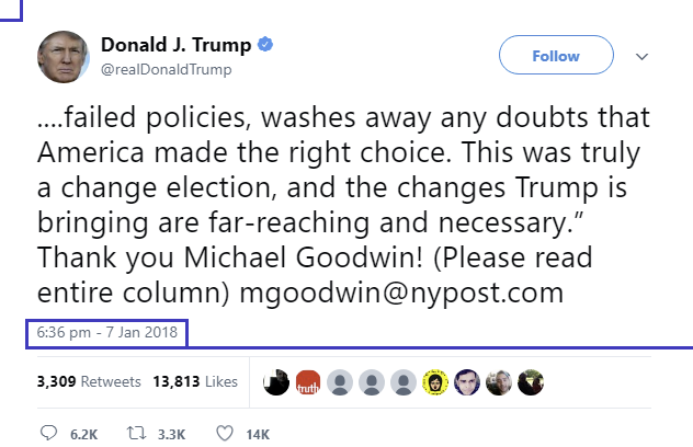 🧵/5- @ 21:21ET (the tweet in the picture is PT, but anons use ET for decodes) on January 7th, Trump tweets a quote from an article by Michael Goodwin, it is a two part post, Now for some important context: when this happened Twitter had character limits, so when posting a tweet that exceeded the limits most ppl would cut the part that was excessive, post the tweet, hit the + & then paste the excessive part & post it as a follow up & that usually took at most a few seconds, but not for this tweet🤔.
