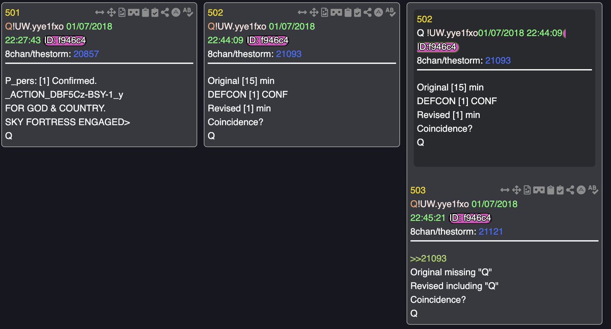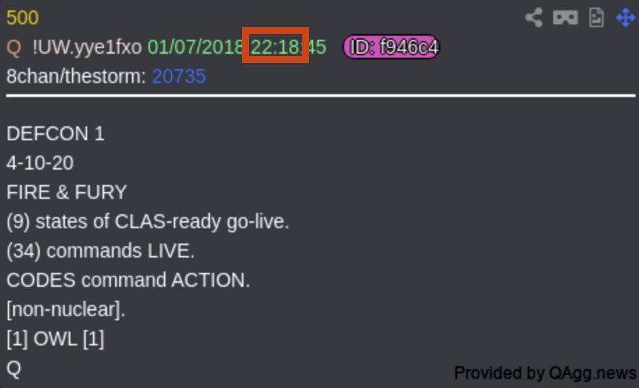 And we then learn later the defcon is(next post in thread), in this sense beyond pointing to the countdown pointed at before leading to the second set of tweets, which TBH didn't even need to be corrected, people made mistakes all the time, and without an ability to edit, most people just let em be, if they did correct them they didn't wait nearly an hour to do so🤷♂️, but yet Q called out that [1] as if he knew for a fact that it would be corrected later, and he posted 2 times right up to post #500 "coincidentally" also a summation of digits equalling [5] which via "LOCK: 15-10-5 Q cued up the [1] Via DEFCON1, @ 22:18ET(pic3rel) which was coincidentally [5] mins before Trump tweeted his first corrected Tweet @ 22:23ET. So yeah that was pretty obvious😎, and was again Q teaching us definitively their comms.